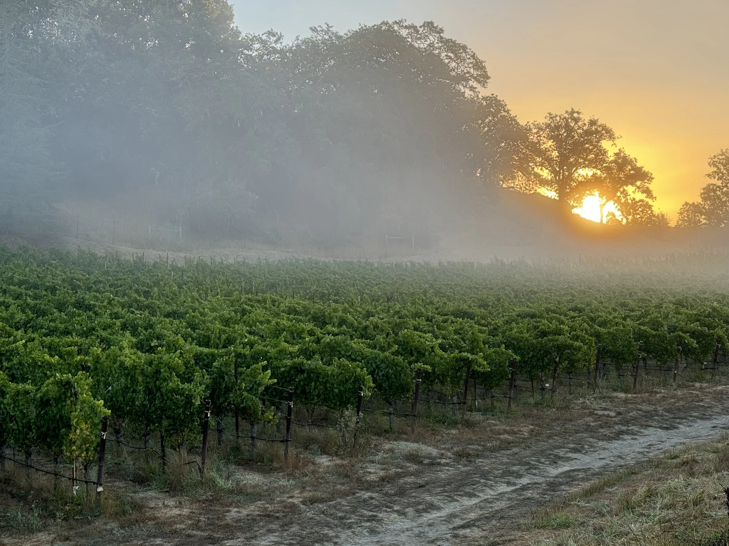 The vineyard sits in a steep edged bowl with a reservoir at it’s base, making it both a concentrator of daytime heat and nighttime cool fog. With a sharp diurnal temperature shift, the grapes are warmed to ripen and cooled for stability each day/night, yielding prime fruit growing conditions for our wine’s expression.